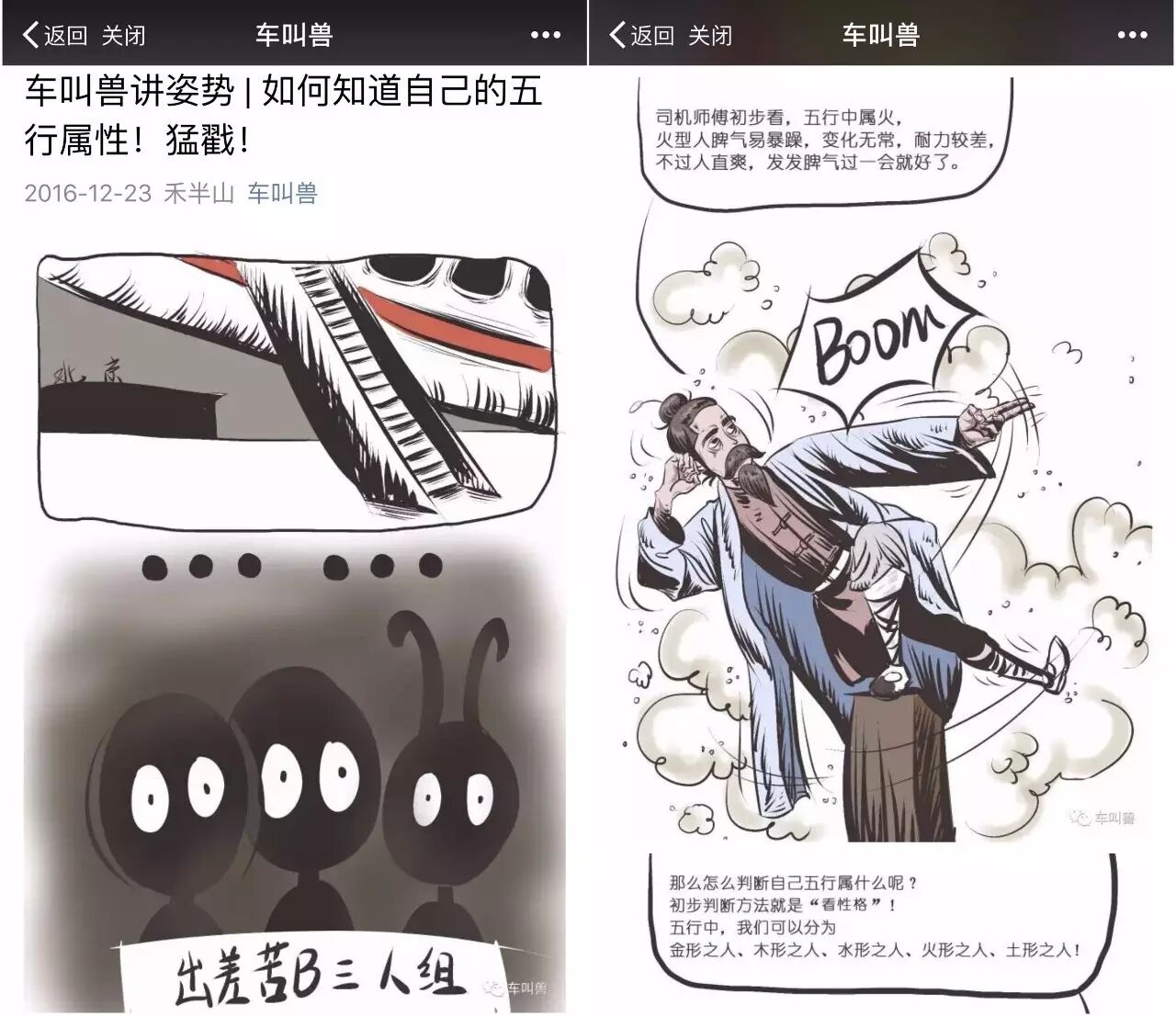 车叫兽:我们粉丝里男性占到80%,很有意思的一点是,女生喜欢星座,但男性喜欢五行八卦这类的东西,这一点你可以从手游有很多五行八卦的设定看得出来,游戏受众也是男性偏多。所以我们最近出这方面的漫画,也会试验这方面内容,后期我们希望五行八卦这块内容能成为我们整个公众号或者说车叫兽社群比较独特、有趣的玩法。