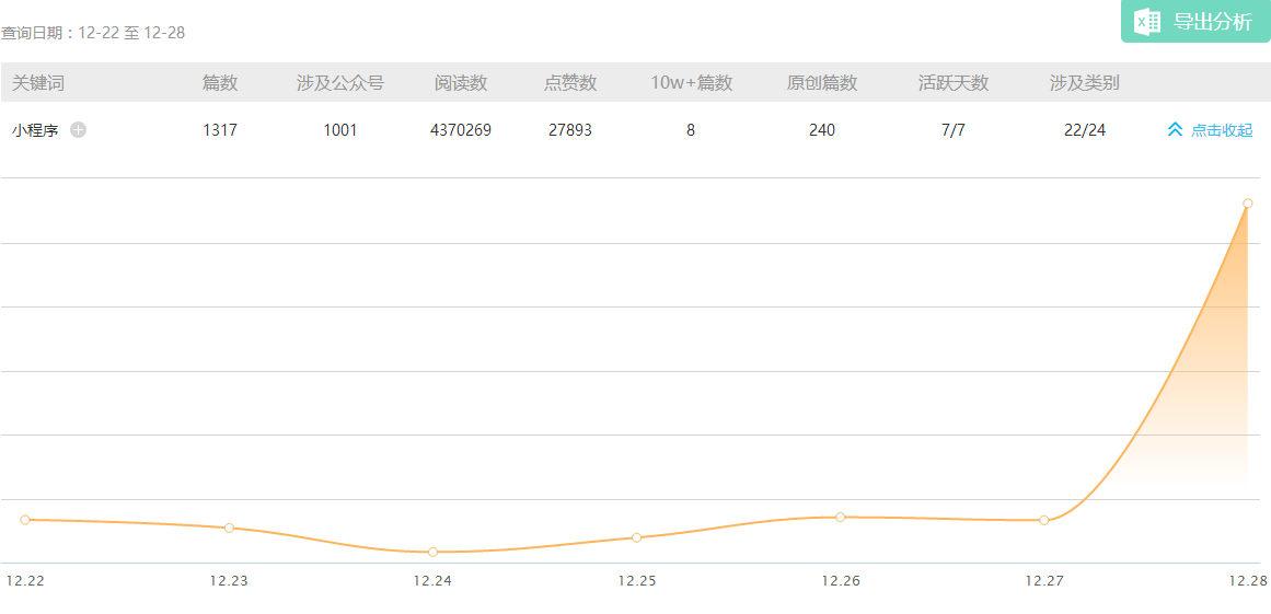 据新榜每日持续监测的32.4万样本数据显示,仅仅12月28日一天,提到“小程序”的微信文章就有736篇。其中原创文章有240篇,10w+有8篇。