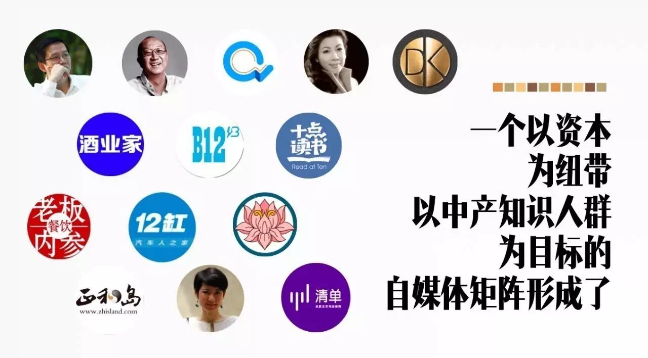 作为布局和后台支撑,过去两年吴晓波和曹国熊一起投资了包括“十点读书”“灵魂的香气的女子”“餐饮老板内参”“张德芬”“杜绍斐”......在内数十个自媒体,在“吴晓波频道”2016年8月下旬推送的那篇《那个跟我一起投自媒体的Tony》中,他就写下:“俨然之间,一个以资本为纽带、以中产知识人群为目标的自媒体矩阵形成了。到目前为止,这一矩阵中的内容公司已超过二十个,覆盖约2500万中产用户。”