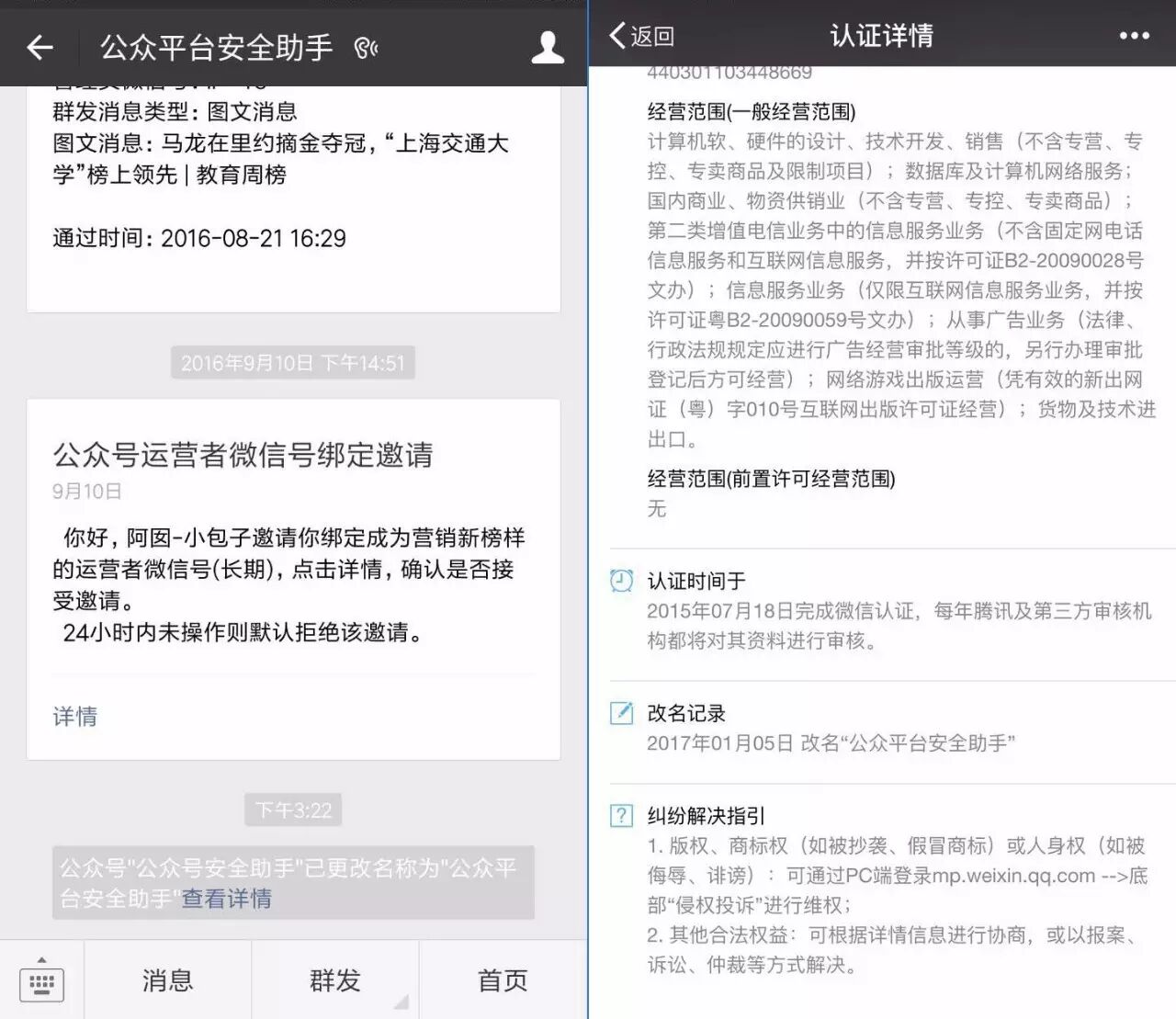 今天下午3点22分,微信官方管理服务号“公众号安全助手”发布消息提示:公众号“公众号安全助手”已经更改名称为“公众平台安全助手”。