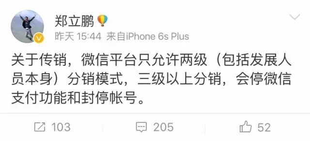 2016年8月22日,认证为腾讯微信安全风控中心高级总监的郑立鹏发表微博称,“微信平台只允许两级(包括发展人员本身)分销模式,三级以上分销,会停微信支付功能和封停帐号。”对此前微信出台的《微信公众平台关于处理返利返现欺诈行为的公告》作了进一步说明。