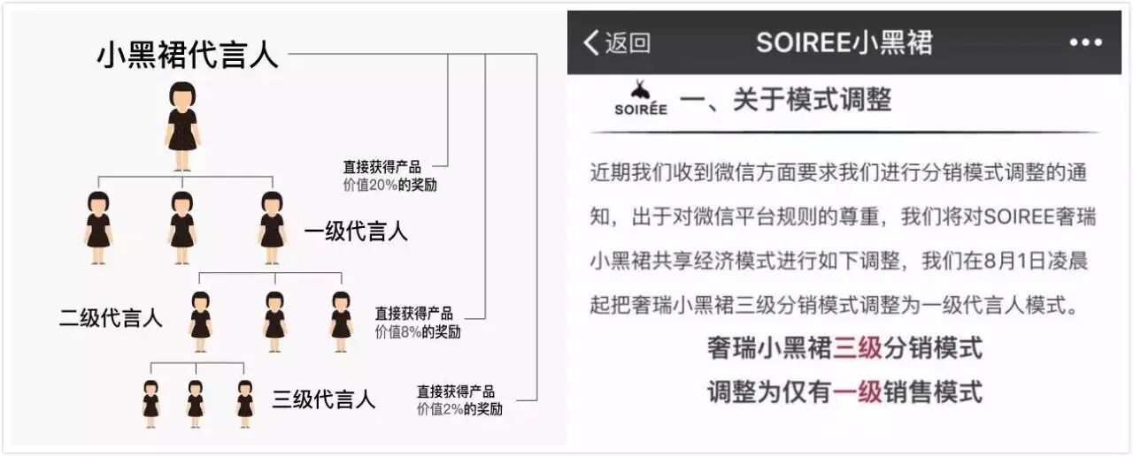 随后,“SOIREE小黑裙”发表公告称:“出于对微信平台规则的尊重,我们将对SOIREE奢瑞小黑裙共享经济模式进行如下调整,我们在8月1日凌晨起把奢瑞小黑裙三级分销模式调整为一级代言人模式。”
