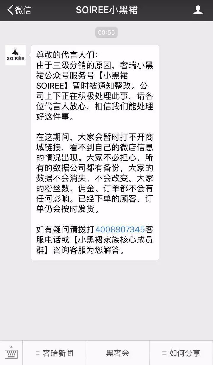 对此, 小黑裙官方给出消息称,由于三级分销的原因,奢瑞小黑裙公众号服务号【小黑裙SOIREE】暂时被通知整改。