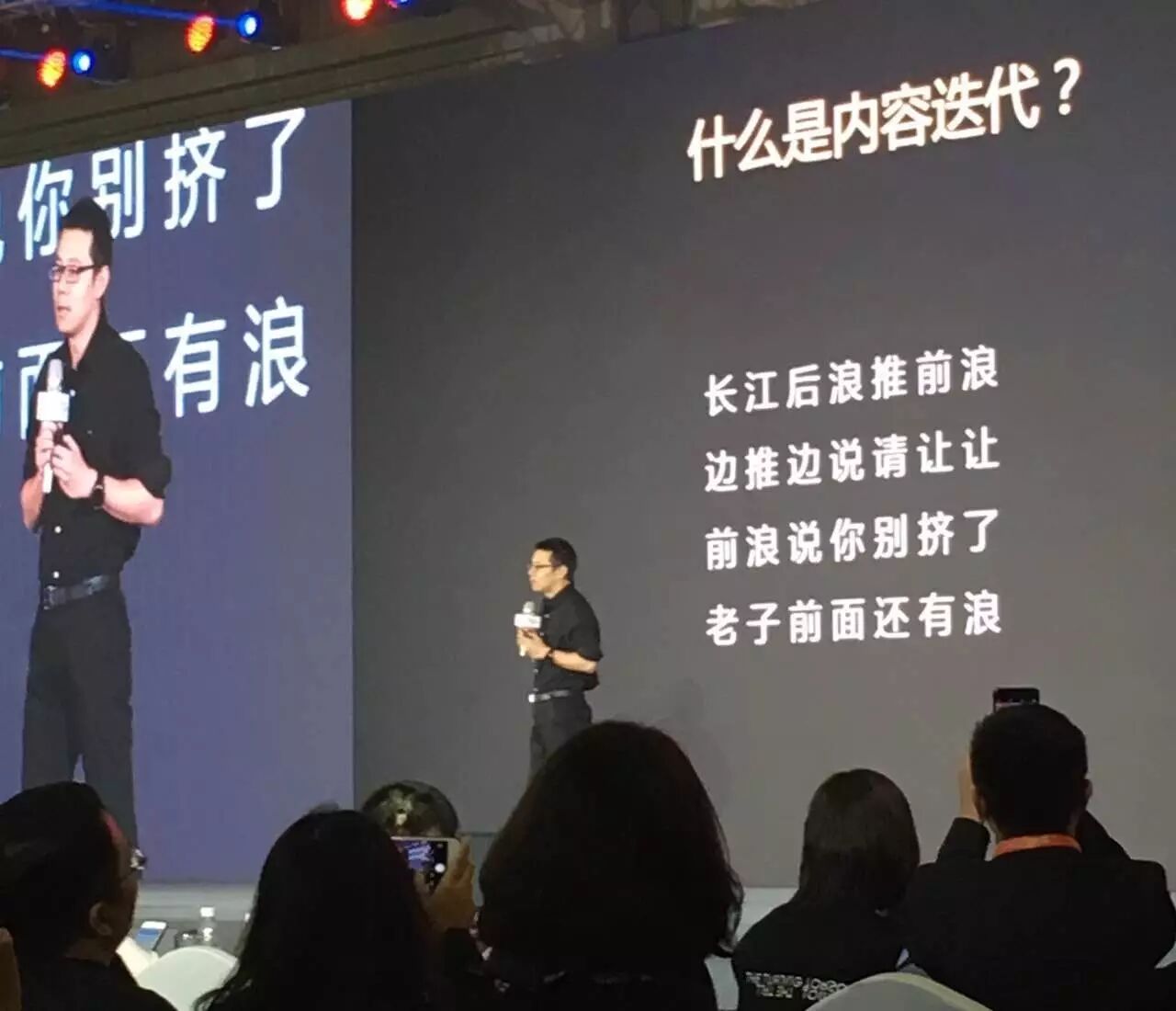一下科技的高级副总裁刘新征一上台就吟了一首诗,博得满场笑声。何为内容创业?“长江后浪推前浪,边推边说请让让,前浪说你别挤了,老子前面还有浪。”接着他也介绍了一下科技联合微博推出的自媒体扶持计划。
