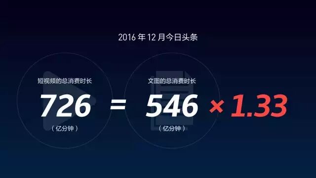 这是2016年12月今日头条上短视频的总消费时长,而12月文图的消费总时长是546亿分钟。短视频的消费总时长已经达到文图消费总时长的1.33倍。
