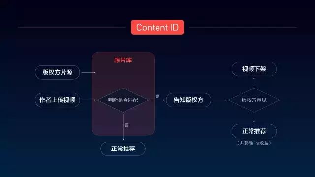 简单来说,Content ID系统将接入视频版权内容,包括综艺、影视剧、MV 等。Content ID可以24小时昼夜不息地在每段视频上传时,将它们与源片库中的作品进行比对。版权方只要将作品上传至源片库,每当视频作者上传视频作品到头条号,Content ID系统就会将这些作品与源片库中的版权内容进行比对,一旦内容产生匹配,版权方可以采取两种处理方式:让侵权视频下架,或正常推荐,获取广告收益。