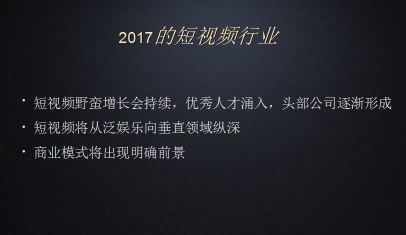2017年对于整个短视频的内容创业市场,是一个关键年份,大家都说是短视频元年,我们前两天推出了一份中国短视频内容行业白皮书,对过去一年做了一些总结,大概是这样的:组织进化从个体转向到组织化机构化发展;消费升级内容上从泛娱乐到垂直内容转型;策略变革平台与内容的合作方式升级;平台竞争创作者对内容平台的偏好逐渐清晰;投资去向贴近垂直领域更易获得资本的青睐。