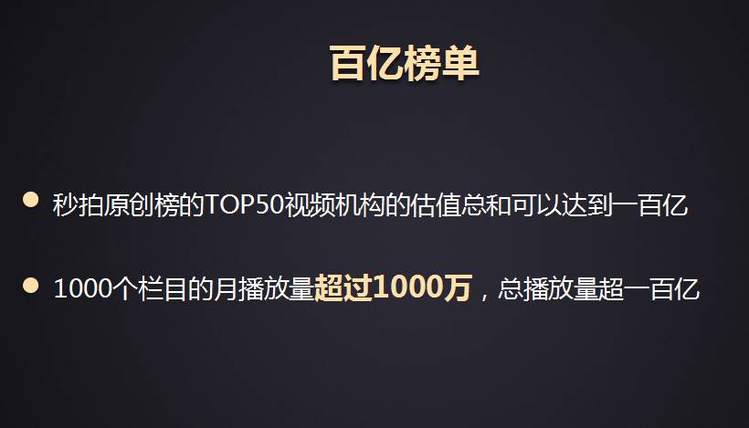 我们的小目标,今年6月起,秒拍开始发布每月的原创视频榜单,我们每个月都会发现TOP50的门槛都会提高一个台阶,每个月都会在TOP50里甚至TOP10里发现一些新面孔,我们希望一年后的秒拍原创榜是一个“百亿榜单”,我们希望的百亿有两层含义,第一,我们希望榜单的TOP50视频机构的估值总和可以达到100亿;第二,我们希望能有1000个栏目的月播放量超过1000万,播放量超百亿。
