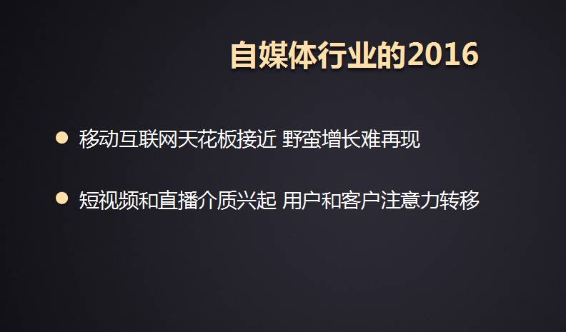 整个内容行业在2016年都面临着巨大变革,面临着平台规模和新介质的冲击,但是我们也要看到对内容创业者最有利的一面,那就是随着下半场的开启,我们发现,平台方和内容提供方的地位发生了本质的变化,优秀内容的价值被不断提升,原来是内容各种跪平台,现在则是平台跪内容,今年,我们看到了各种各样的内容扶持计划,几乎每一家互联网公司都推出了内容扶持策略,甚至像百度这样,从来不愿意为内容付费,内容还要拼命做SEO的公司,都声称要拿出100亿来扶持补贴内容创作者,这是之前从来没有发生的事情。