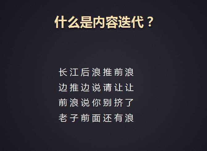 我说我大概明白了,然后我就想起一首诗,我觉得形容内容行业,形容内容平台的迭代进化,都蛮合适的:长江后浪推前浪,边推边说请让让,前浪说你别挤了,老子前面还有浪。