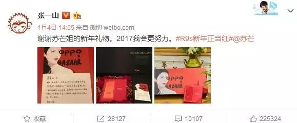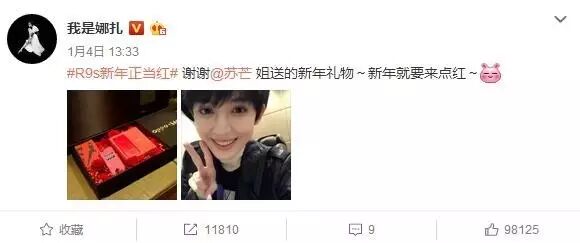 苏芒与不少明星私交不错,她将这款手机礼盒赠送给李小璐、贾乃亮、王祖蓝、邓超、孙俪等很多明星。张一山、古力娜扎、毛晓彤等收到礼盒的人气明星明星都在微博上晒出了OPPO R9s新年苏芒设计款。