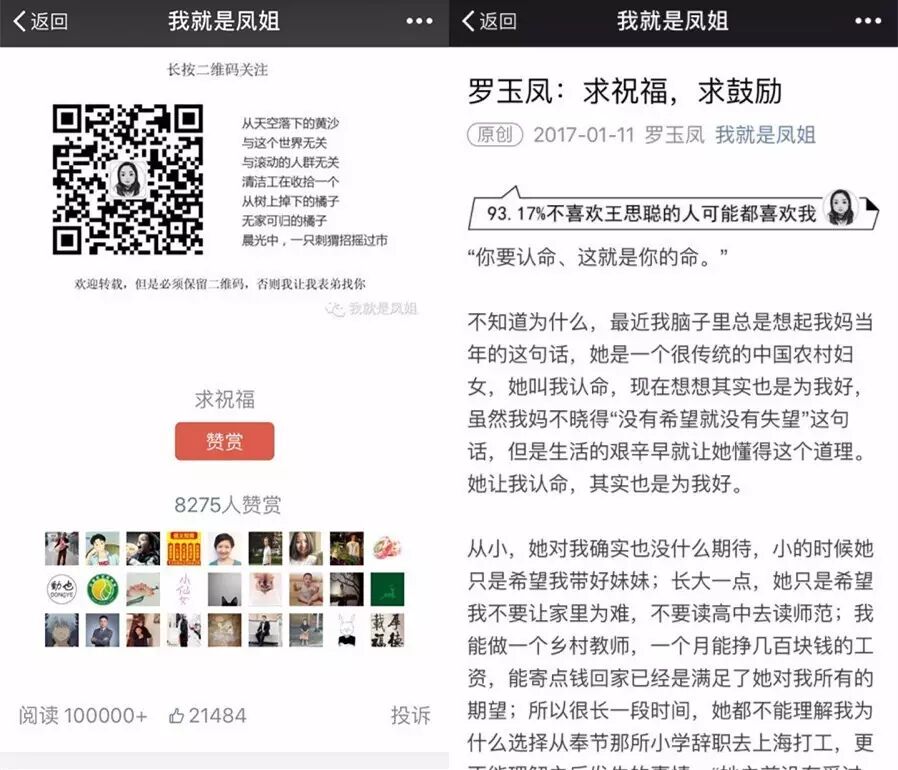 文末,凤姐表示,目前只差一张美国绿卡,求祝福,求鼓励。截至下午5点,文章阅读量突破10w+,获得8千多人赞赏。此前,新榜曾撰文《四篇文章涨粉7万,凤姐开公号前曾专门研读“咪蒙”》对“我就是凤姐”进行报道,据悉,该账号主要是包括凤姐在内的三个人运营,她在国内的表弟协助完成了注册账号,凤姐只负责文字内容和看后台留言,而她的朋友则负责其余剩下的一切运营事宜,包括编辑、排版以及发布。