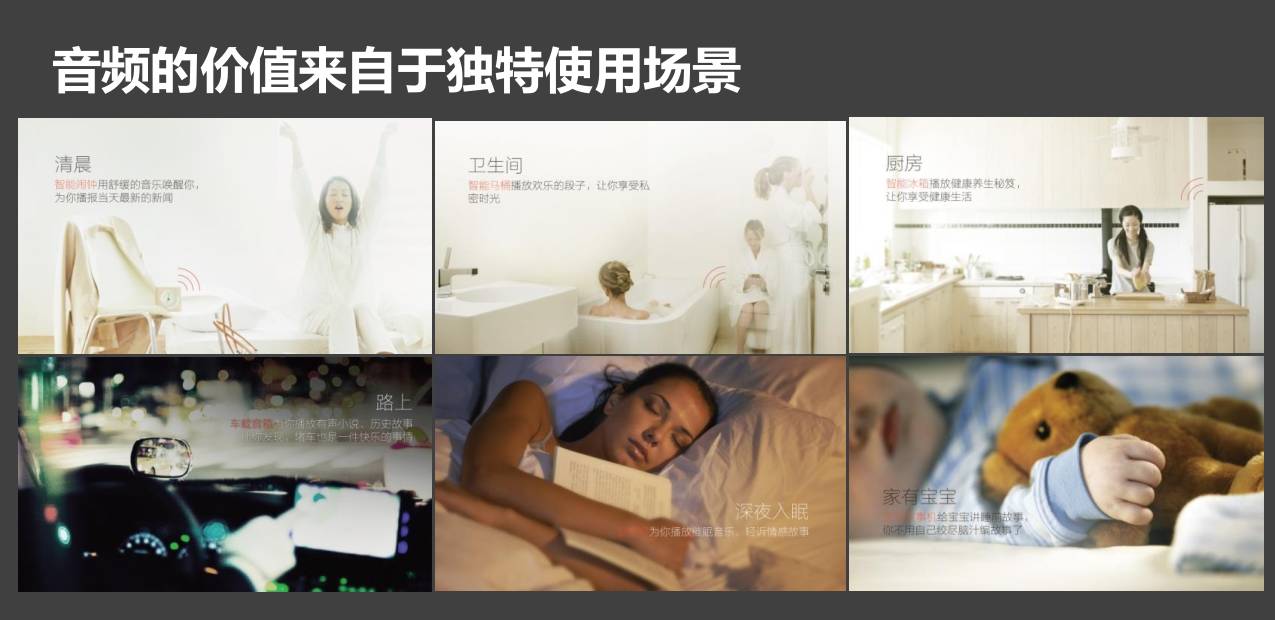 从以上现象我们也可以思考得出一些共性规律:也就是文字媒体、视频媒体、音频媒体的关系;文字是浏览效率最高的媒体,视频是最生动的多重感官媒体,音频是移动互联上最省时间的媒体,是唯一的伴随式媒体,可以让每个人的碎片时间有价值,这就是音频的优势。