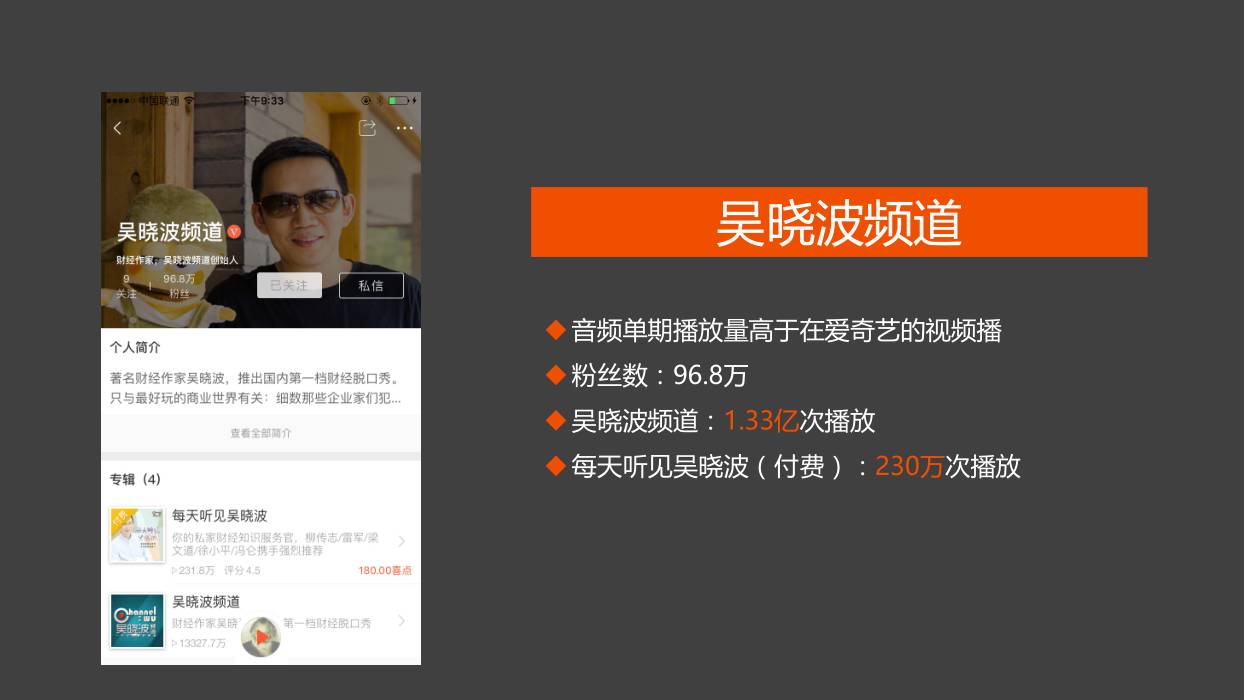不管是早期的“罗辑思维”或者“吴晓波频道”,在喜马拉雅都比视频网站播放高很多。