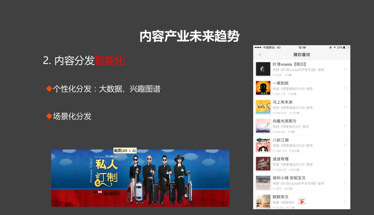 第二个趋势是内容的分发越来越智能化,它将基于大数据的分发,基于图谱的分发,基于场景的分发,基于你的兴趣,基于各种维度做智能化的分发。音频的流行也是刚刚开始,移动时代音频的特点是伴随的媒体,你可以每天不用浪费你的时间,反而可以省很多的时间,让你所有的碎片时间变得更加的有价值。人工智能的发展又可以把音频的分发带到全新的时代。