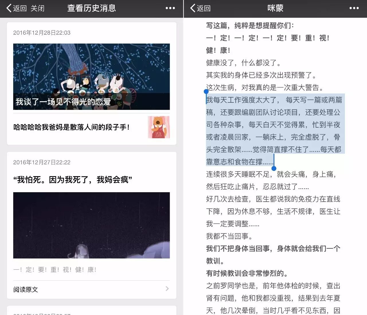 Ps. 咪蒙曾在推文《我怕死。因为我死了,我妈会疯》中交代过自己的病情以及工作强度,榜妹也把截图po上来,祝咪蒙早日康复,也提醒所有小编注意身体。