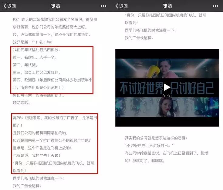 文章末尾,咪蒙不但“傲娇”地晒出了贵司的年终奖福利,还隆重推荐了公号的第一支视频广告《不讨好世界,只讨好自己》。