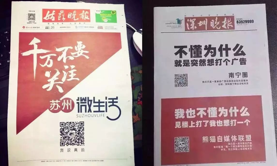 “咪蒙”“有车以后”的视频广告之外,似乎没听说过有很大动静的公众号视频广告。但公众号投放报纸头版的广告却有不少:熊猫自媒体、“南宁圈”等曾在《深圳晚报》头版包下整版广告;“苏州微生活”也登上过当地报纸《姑苏晚报》的头版……