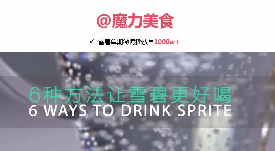举个例子《魔力美食》,这就是完完全全面向微博产生的内容品牌,它在微博上只用了三个月就产生了100万粉丝。首先在选题上,就会研究在微博热榜上面到底有哪些内容哪些话题更容易上热搜,那么这样的内容,需要的用户的传播点、用户感兴趣的点是什么样子,比如说我们的起标题的方式,“六种方法让雪碧更好喝”这样的在微博上是更容易受到关注和转发的,所以这条视频在微博上当时也是刷爆了各大榜单,也有单期一千万次的播放。