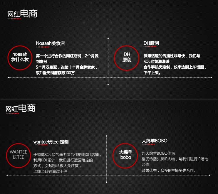 同时我们还在电商领域做出了新的尝试,根据不同网红博主的不同特点,为他们量身打造了最合适也最有效的电商发展道路。
