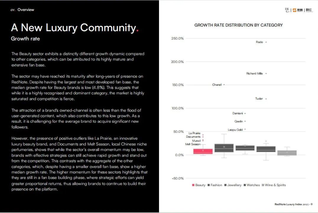 尽管拥有规模最大、发展最完善的粉丝基础,但在小红书长期发展后,美妆行业或许已达成熟期,美妆品牌的增长率中位数较低(4.5%)。这表明,尽管美妆是一个高度认可且占据主导地位的品类,但市场已高度饱和,竞争十分激烈。