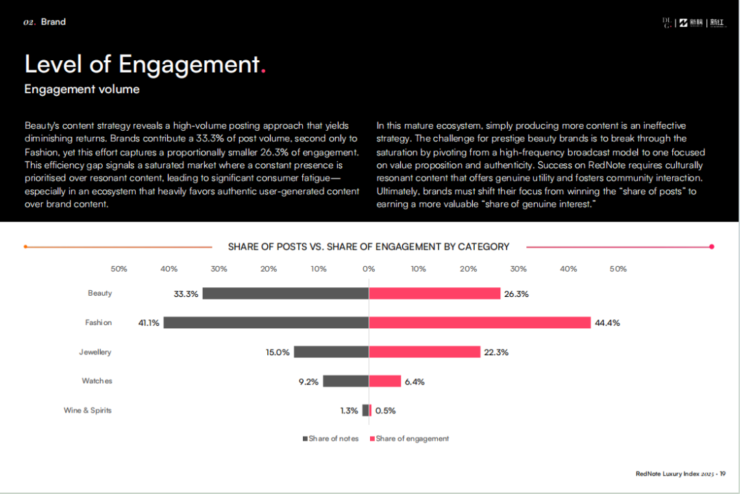 在这个成熟的生态系统中,单纯生产更多内容是一种无效的策略。高端美妆品牌要突破这种饱和状态,需从高频的 “广播式” 内容模式转向聚焦价值主张与真实性的模式,而这对它们而言是一项挑战。在小红书上取得成功,需要打造经精心策划且能引发共鸣的内容 —— 这类内容往往源自社区,还能促进社区互动。最终,品牌必须将焦点从 “发帖份额” 转向赢得更有价值的 “真正的关注度份额”。