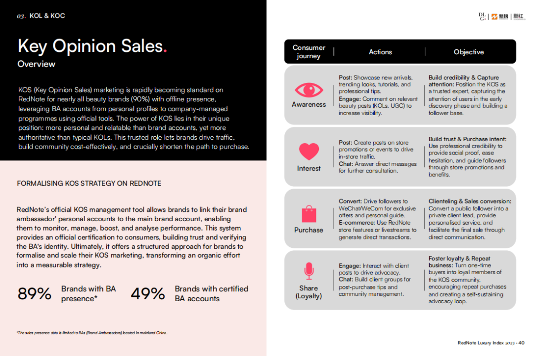 KOS(关键意见销售)营销正迅速成为小红书平台上几乎所有拥有线下渠道的美妆品牌(90%)的标准模式。该策略通过官方工具将美容顾问个人账号转化为企业管理项目。其核心优势在于独特定位:较品牌账号更具亲和力,较传统KOL更具权威性。这种可信角色使品牌能高效引流、低成本建群,并显著缩短购买决策路径。