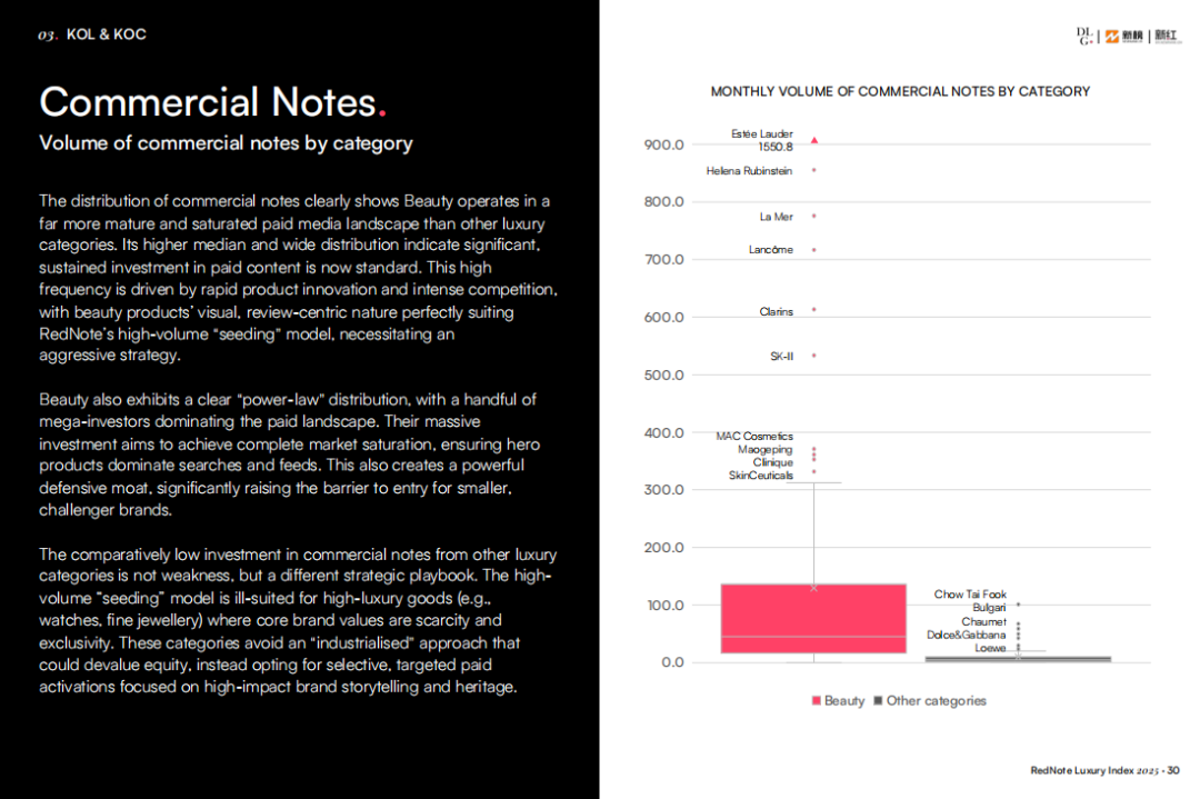 商业笔记的分布清晰表明,美妆行业所处的付费媒体生态,远比其他奢侈品品类更成熟、更饱和。其付费内容相关数据的中位数更高且分布更广泛,这意味着对付费内容进行大规模且持续的投入,如今已成为行业常态。这种高频态势由快速的产品创新和激烈的竞争驱动,而美妆品牌视觉化、以测评为核心的属性,与小红书的大规模 “种草” 模式完美适配,这使得品牌必须采取积极进取的策略。
