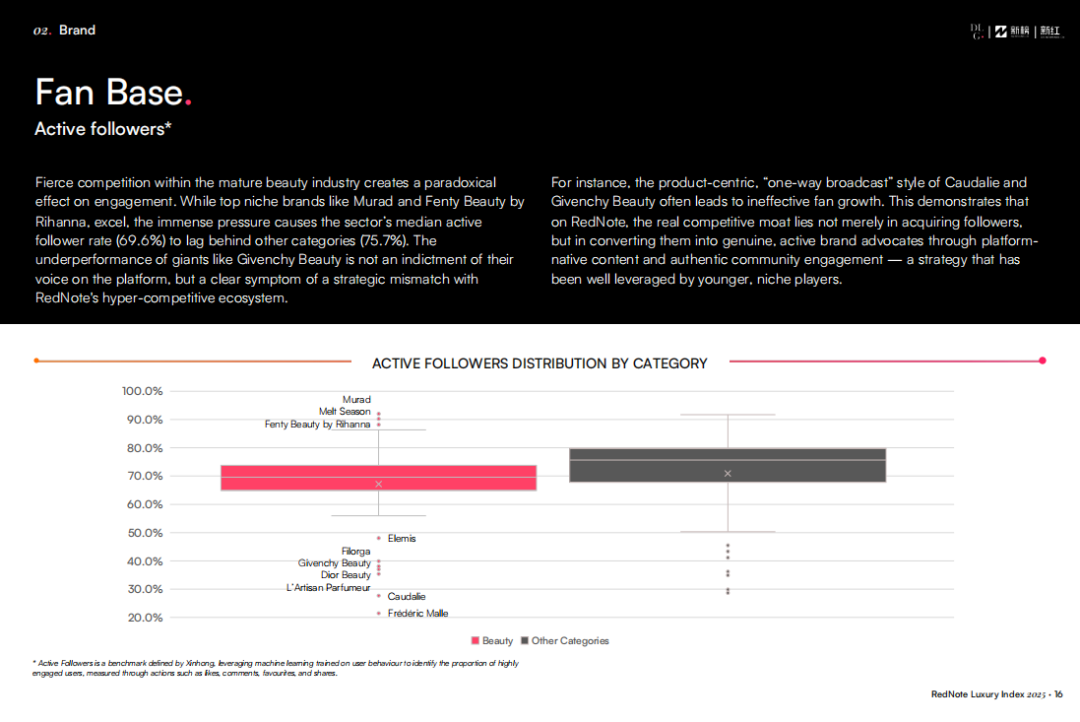 ■ 美妆行业的活跃粉丝率中位数(69.6%)低于其他品类(75.7%);