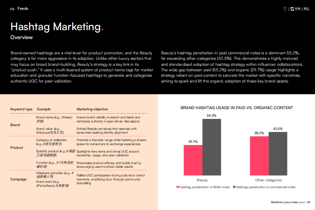 品牌自有话题标签是产品推广的关键手段,而美妆品类在运用这类标签上要积极得多。与其他可能聚焦品牌建设的奢侈品领域不同,美妆行业的策略是其 “产品推广” 链路中的核心环节:它借助细致的多层级产品名称标签体系开展市场教育,并利用聚焦功能的话题标签,生成并归类真实的用户生成内容(UGC),以获取同侪的认可。