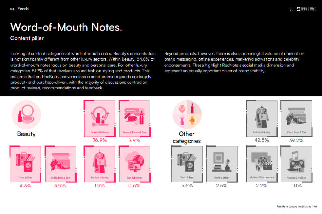 从种草笔记的内容类别来看,美妆行业的内容集中度与其他奢侈品领域并无显著差异。在美妆领域内,84.8%的种草笔记聚焦于美妆个护。对于其他奢侈品品类,小红书上围绕高端商品的讨论中,有81.7%在很大程度上被归类为围绕造型和产品展开。这证实,美妆领域的讨论以产品和购买为导向,大部分讨论集中在产品评测、推荐与反馈上。