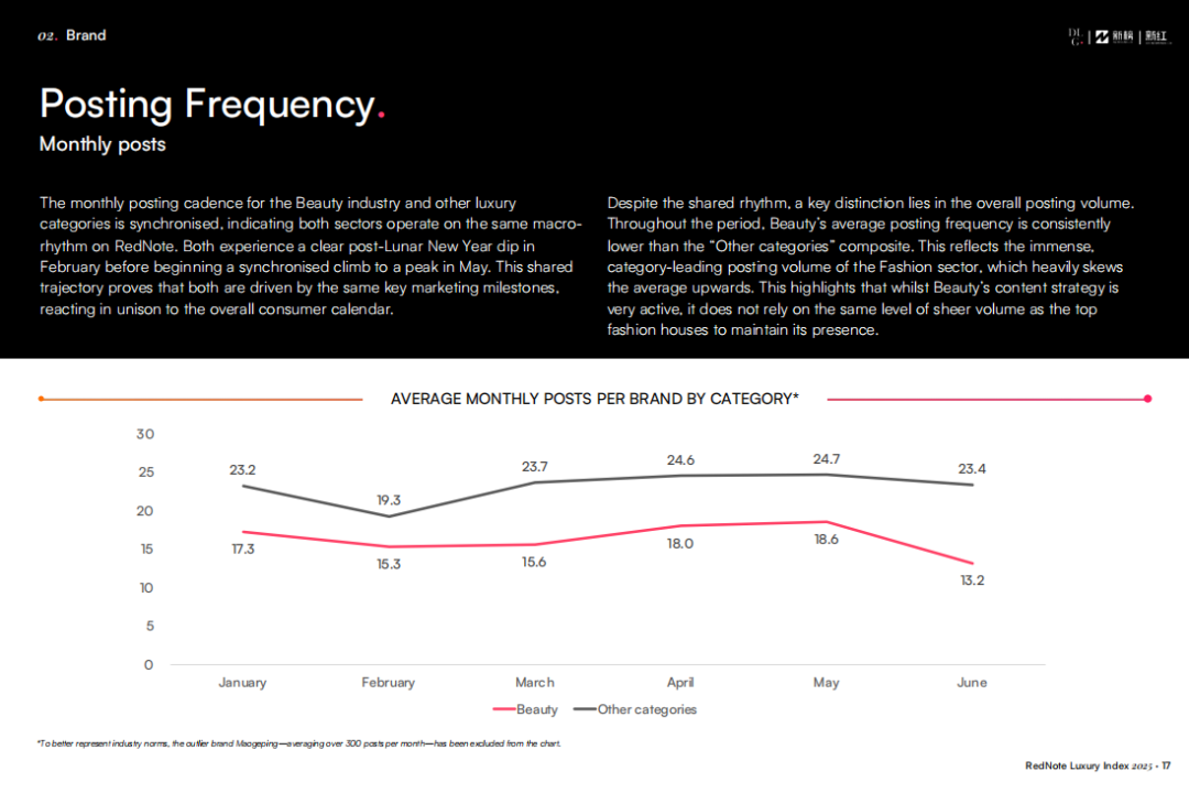 美妆行业与其他奢侈品品类的月度发帖节奏是同步的,这表明两个领域在小红书上遵循着相同的宏观节奏。两者在农历新年后的2月都会经历一段沉寂期,随后开始同步攀升,直至5月达到峰值。这种共同的轨迹证明,两者都受到相同关键营销节点的驱动,会一致地对整体消费者日历的节奏做出反应。