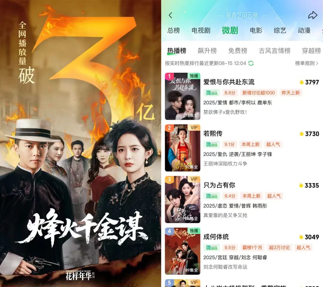 陈七岁认为,爆款要看概率,很多时候平台要的是稳定,而不是爆款,而郑州最擅长的就是稳定生产80-85分的短剧。花样年华影业制作的《烽火千金谋》全网播放量超3亿,星曼互娱制作的《爱恨与你共赴东流》登上过爱奇艺微剧热播榜榜首。
