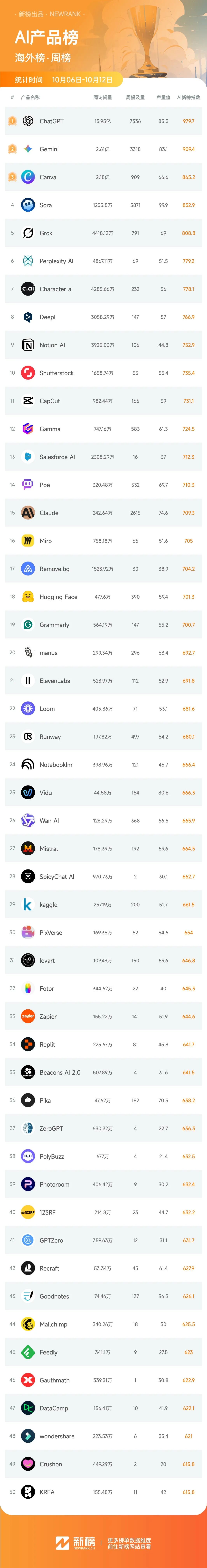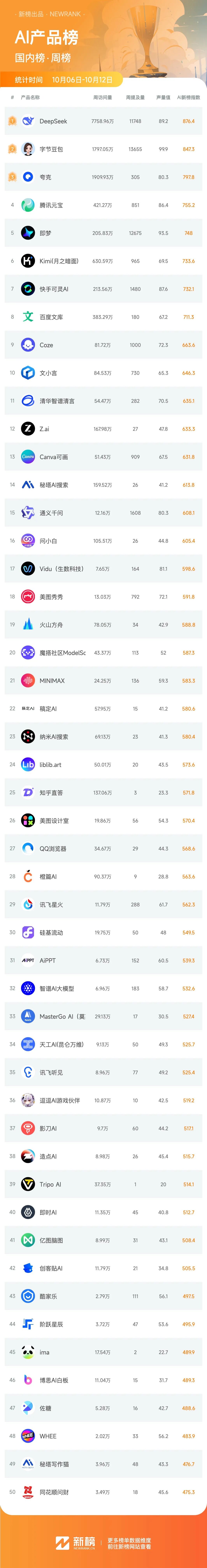 欢迎关注「AI新榜-AI产品榜」,这是由新榜出品的榜单产品,包含月榜和周榜。 AI产品榜旨在为用户提供一个了解和选择AI产品的便捷途径。我们希望能更客观全面地展现这些AI产品在市场上的表现和用户的接受程度。通过这个榜单,开发者可以了解自己产品及竞品的市场表现,进而调整优化提升产品竞争力。 我们在全球范围内上千AI产品工具中筛选出前100个热门产品,以访问量、下载量、提及量、声量值等关键数据作为评价指标,综合形成AI新榜指数。 本期为第58期周榜,统计时间为2025年10月6日-2025年10月12日,榜单分为总榜、国内榜、海外榜。 欢迎围观: - 总榜 - - 国内榜 - - 海外榜 - 更多细节请移步新榜官网「AI产品榜」栏目查看: https://www.newrank.cn/aiRank 后续我们还将持续优化,更新计划包括但不限于:以研发地域、产品类别等维度,增加更多分类排行,旨在让榜单内容更丰富且具参考性,欢迎各位关注与评论。 「AI新榜交流群」进群方式:添加微信“banggebangmei”并备注姓名+职业/公司+进群,欢迎玩家们来群里交流,一起探索见证AI的进化。 欢迎分享、点赞、推荐 一起研究AI