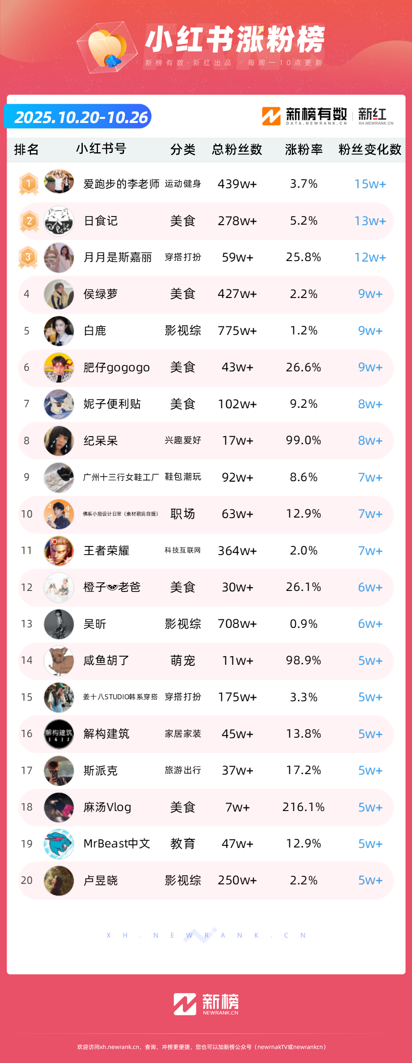 依托新榜旗下小红书数据工具“新红”,新榜推出「小红书涨粉榜」,本次统计周期为2025年10月20日到2025年10月26日。