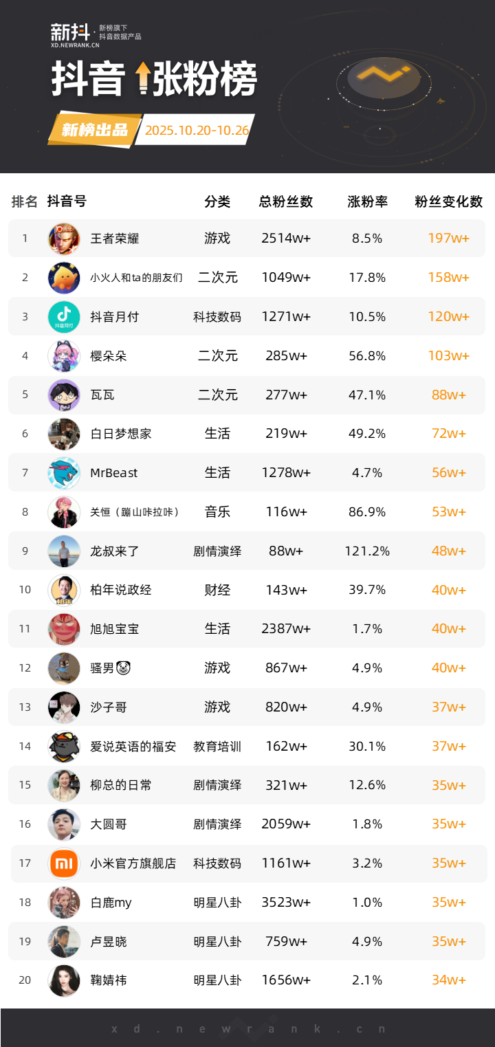 依托新榜旗下抖音数据工具“新抖”,新榜推出「抖音涨粉榜」,每周一期。本次统计周期为2025年10月20日到2025年10月26日。