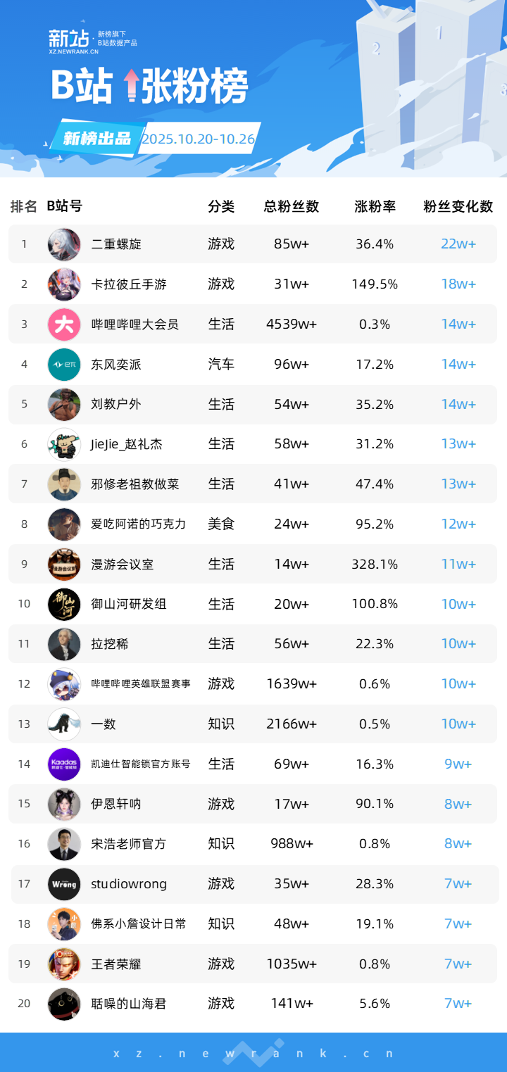 依托新榜旗下B站数据工具“新站”,新榜推出「B站涨粉榜」,本次统计周期为2025年10月20日到2025年10月26日。