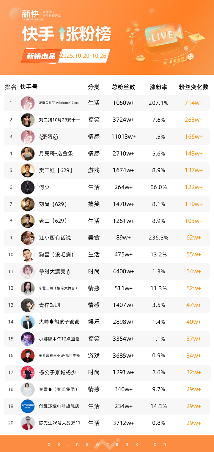 依托新榜旗下快手数据工具“新快”,新榜推出「快手涨粉榜」,本次统计周期为2025年10月20日到2025年10月26日。