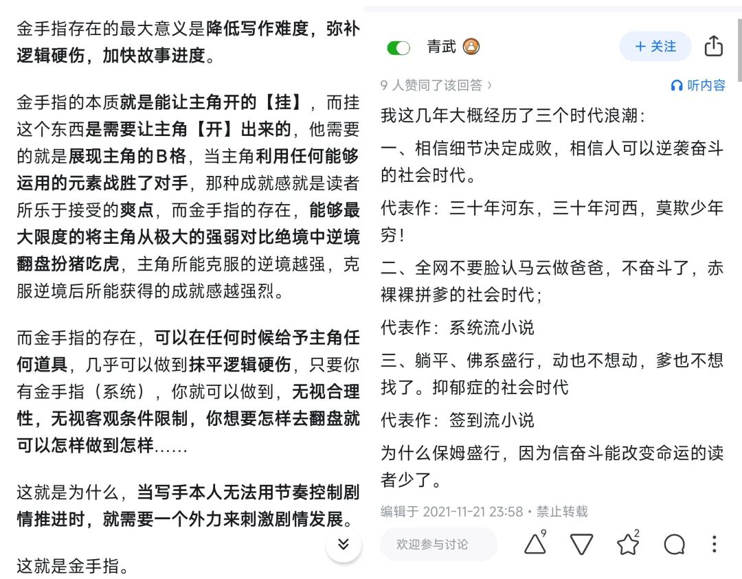 知乎用户“伊瓦的战士莱曼”(左)和“青瓦”(右)对金手指的分析