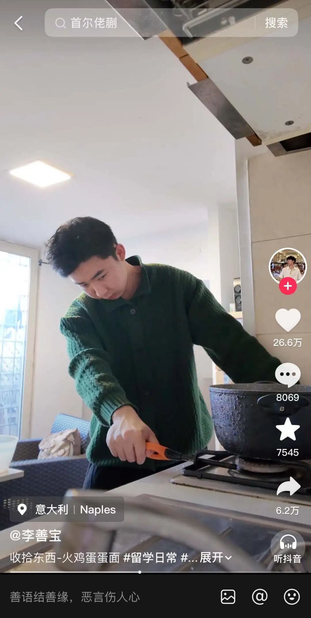 “白日梦想家”走红后,互联网上一批拍摄求生式留学vlog的博主也跟着人气暴涨,比如在韩国留学的“首尔佬蒯”、在日本的“讲英格力士.”、意大利“老鼠人”留子“李善宝”等,他们虽然粉丝体量不大,但近期均有多条视频在抖音获赞几十万。