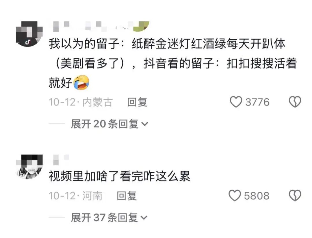 这些留子们身处不同国家,视频中都是一副“命很苦”的样子,孤独的时候只能自言自语发疯,有人评论:“我一直以为留学是一件很体面的事情,直到‘白日梦想家’‘李善宝’等博主一个接一个出现在我抖音里。”