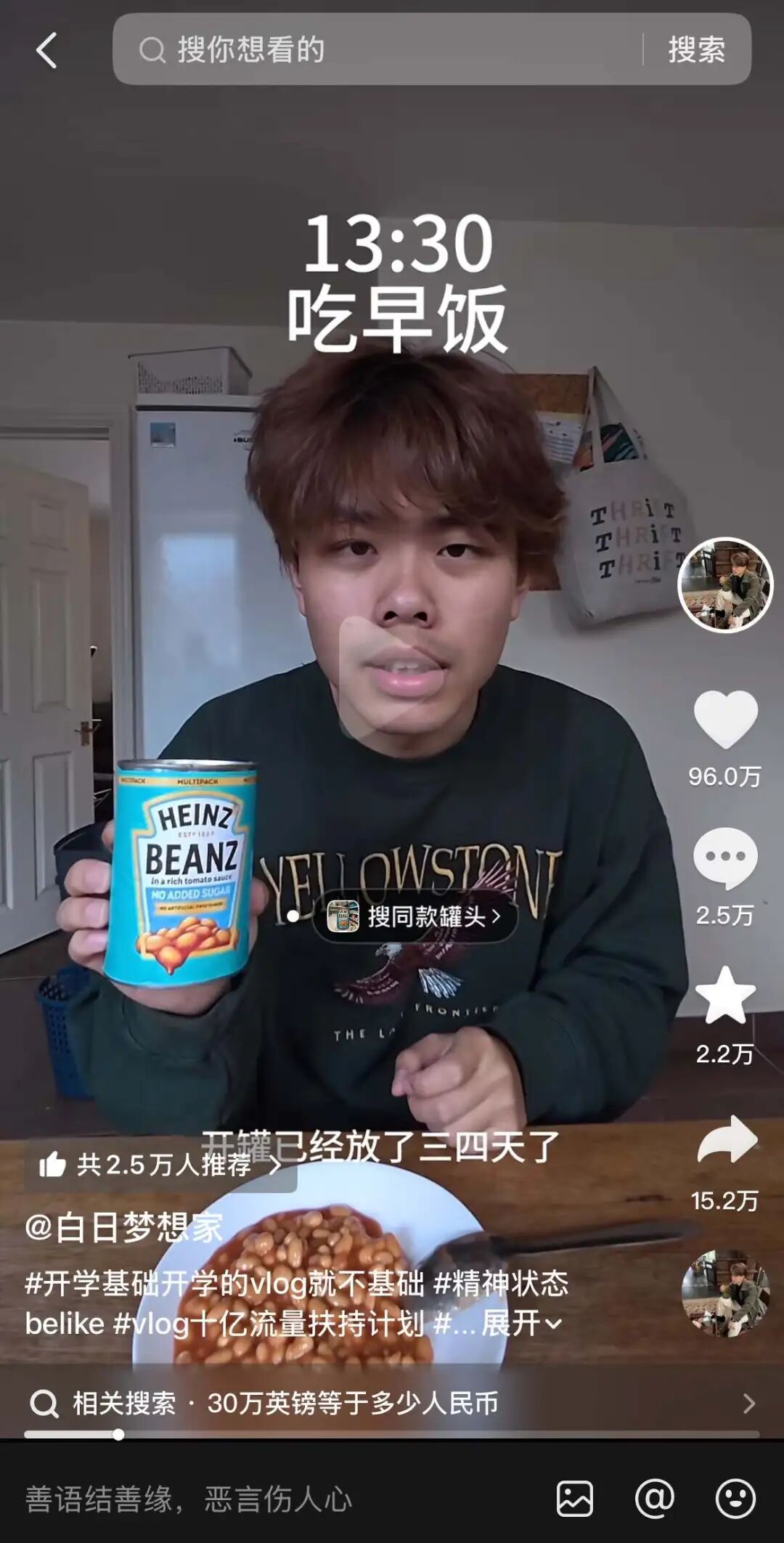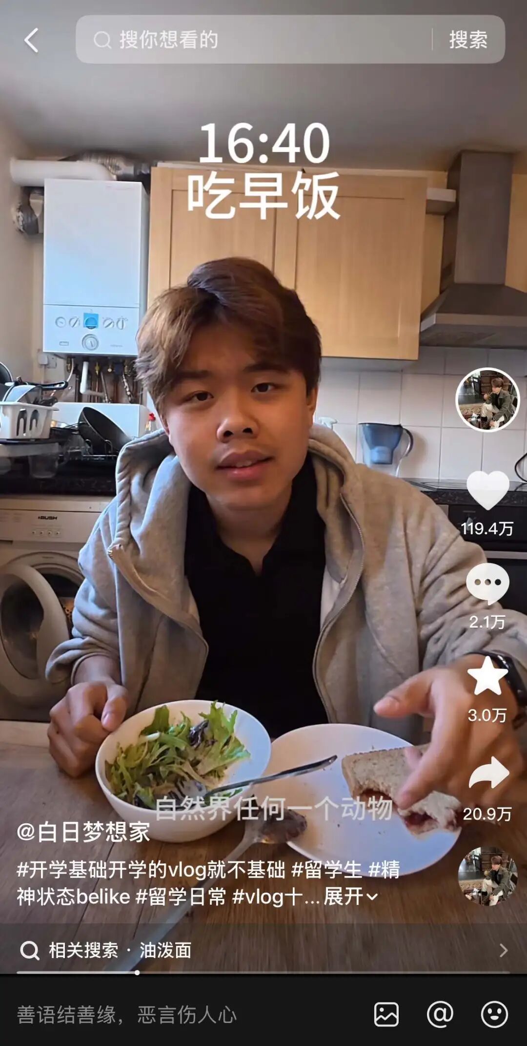 在英国留学的“白日梦想家”过出了一种荒野求生的既视感,风格酷似去年因不修边幅形象和抽象吃播走红的博主“咸鱼梦想家vlog”,他也因此被网友称为“英国版咸鱼梦想家”。
