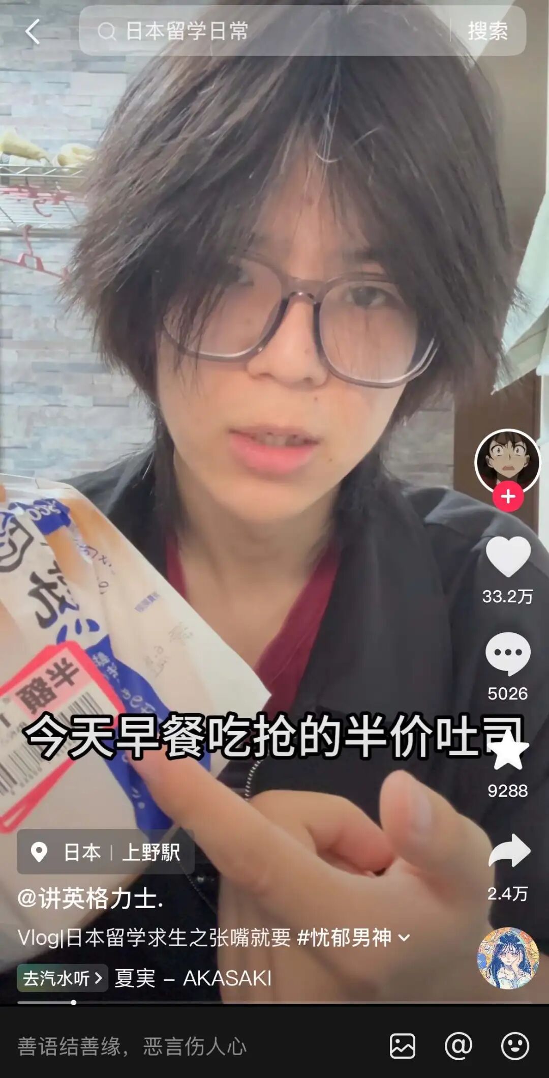 在日本留学的“讲英格力士.”也通过求生式vlog走红,吃饭靠抢半价吐司、煮泡面以及找同学“要饭”。