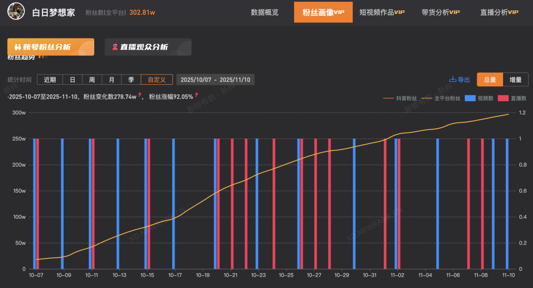 新榜旗下抖音数据工具新抖显示,从10月7日开始,“白日梦想家”的抖音账号开始疯狂涨粉,近一个月的时间,涨粉超278万,其小号“世界上没有柠檬”涨粉超81万,累计涨粉超359万。