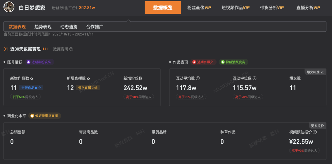 新抖数据显示,目前“白日梦想家”商业合作视频预估报价为22.55万元,高于90%的同级达人。