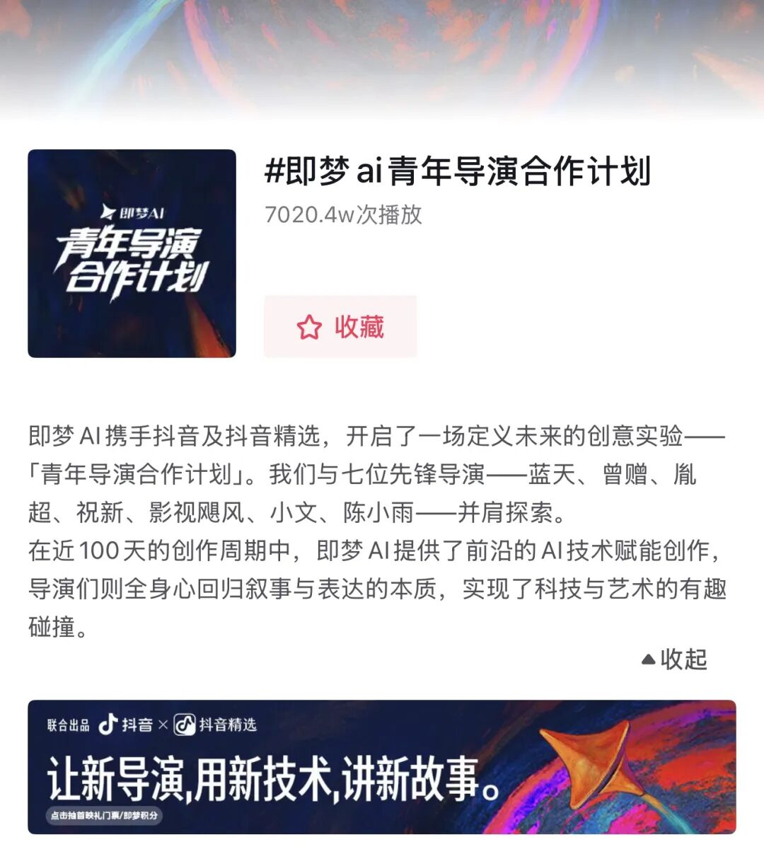 “AI新榜”也去到现场,在大银幕上,我们看到了完全不输“专业影视级”的AI短片。无论从故事丰富性、视觉艺术感以及打斗、对话等复杂场景的呈现上,都有了新的提升。截至目前,抖音#即梦ai青年导演合作计划 话题播放量超7000万。