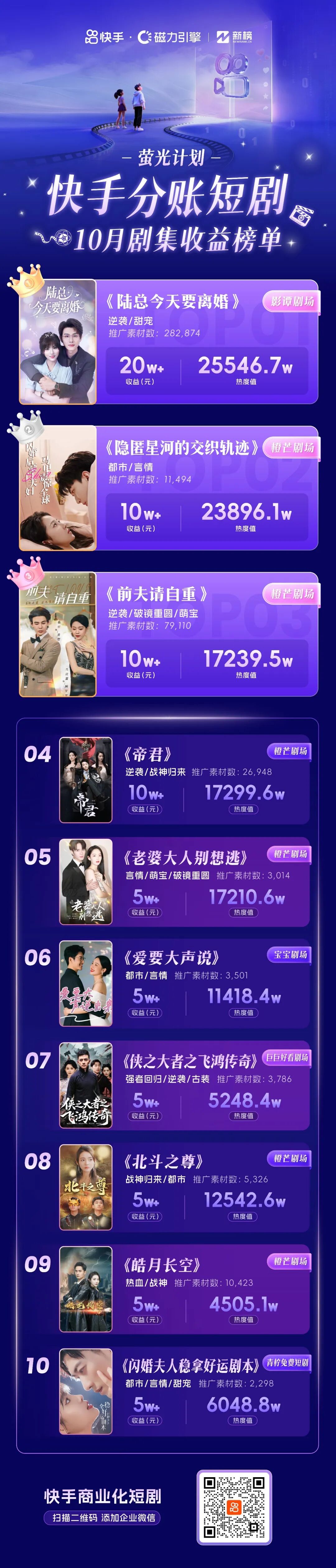 上下滑动,查看快手分账短剧10月聚集收益榜单