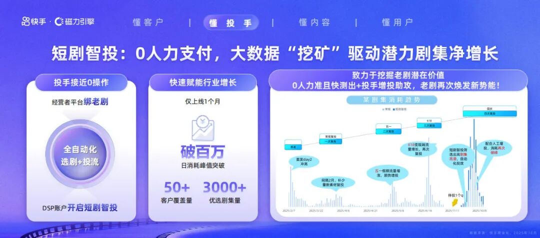 今年9月,快手上线“短剧智投”功能,实现了全自动化选剧、投流,节省人力的同时,也延长了短剧整体的经营生命周期。“短剧智投”仅上线一个月,日消耗峰值就突破百万元,优选剧集超3000部。
