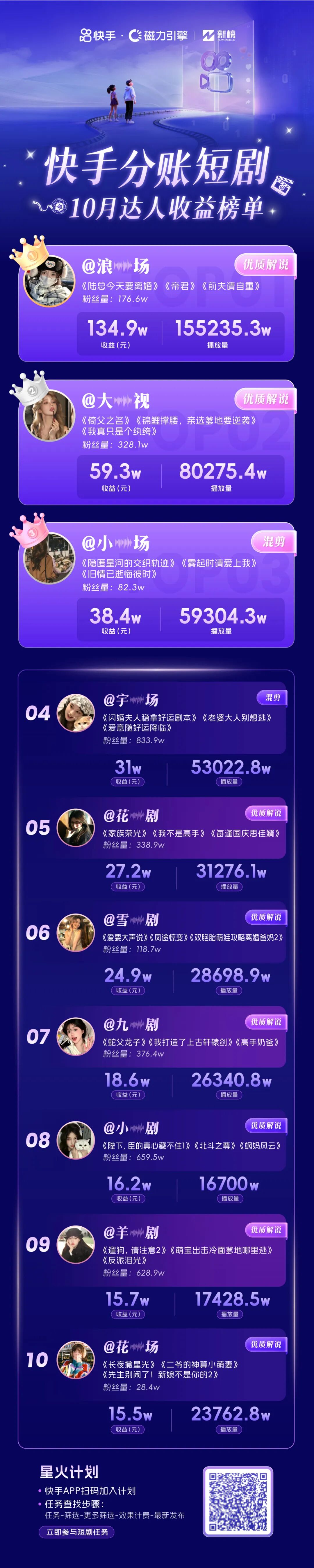 上下滑动,查看快手分账短剧10月达人收益榜单