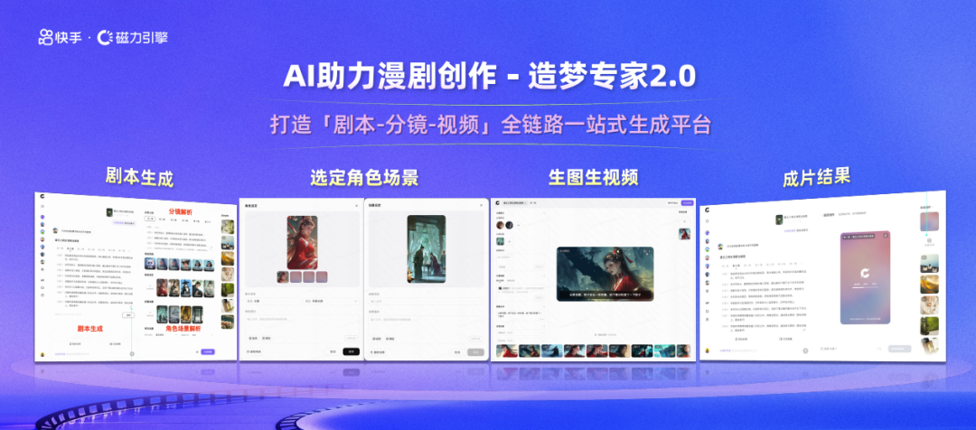 其中,为了解决漫剧成本高、周期长的产能痛点,快手产研团队历时2个月研发出全链路一站式生成平台造梦专家2.0。在造梦专家2.0的帮助下,短剧创作者可以极大提升剧本、分镜、视频等环节的创作效率,一个人就能抵得上一个漫剧制作团队。